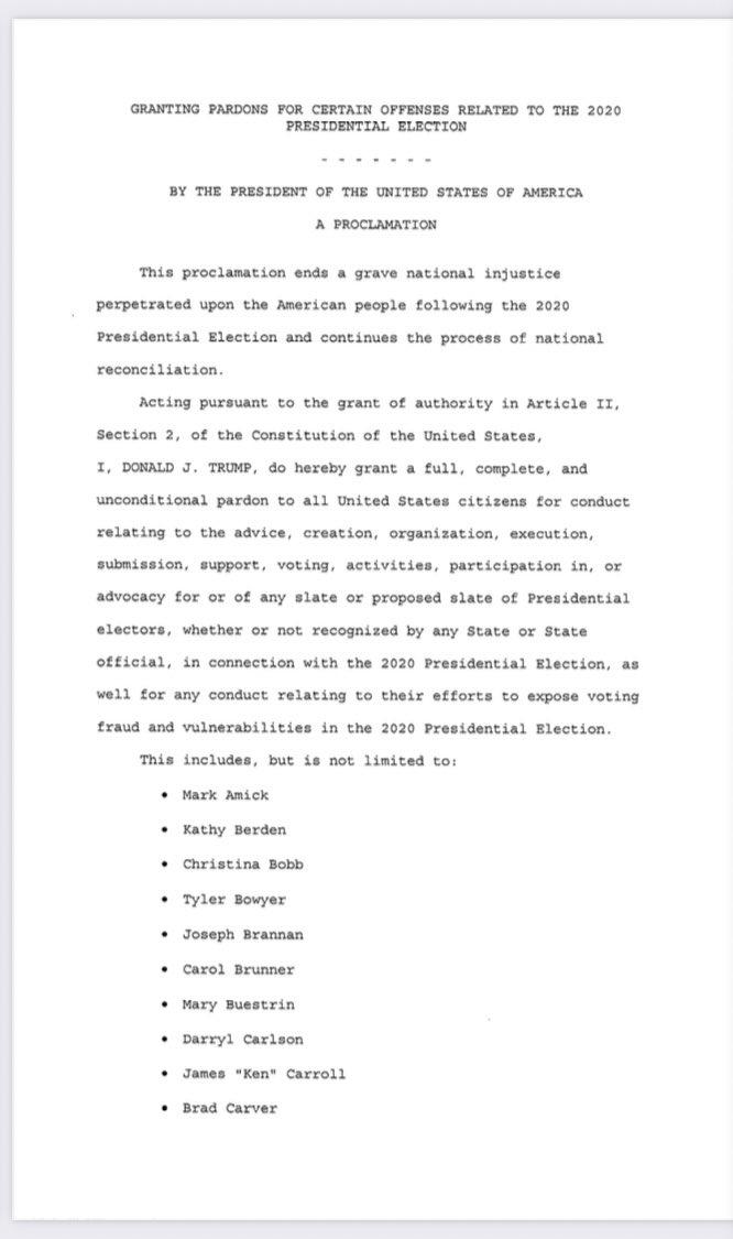 "Ця офіційна заява покладе край серйозній національній несправедливості, вчиненій щодо американського народу після президентських виборів 2020 року. Я, Дональд Трамп, справжнім оголошую повне, беззаперечне помилування всім громадянам США за дії, пов'язані з їхніми зусиллями щодо виявлення фальсифікації при голосуванні на президентських виборах документа.