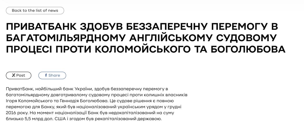 Лондонський суд зобов'язав Коломойського та Боголюбова виплатити 3 мільярди доларів у справі про "Приватбанк"