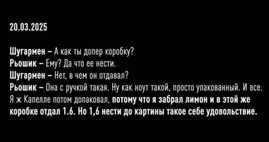 "Вона з ручкою така. Ну як ноут такий, просто упакований. І все. Я ж Капелі потім допакував, тому що я забрав лимон і в цій же коробці віддав 1,6. Але 1,6 нести до картини таке собі задоволення", - відповів Решик.