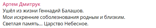 "Пішов із життя Геннадій Балашов. Мої щирі співчуття рідним та близьким", - написав Дмитрук.