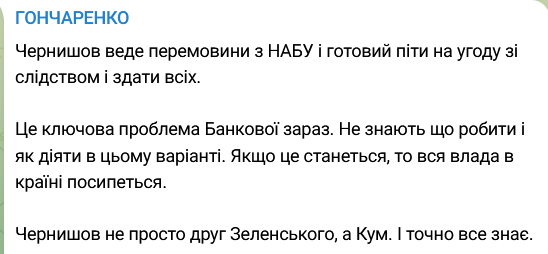"Це ключова проблема Банкової зараз. Не знають, що робити і як діяти в цьому варіанті. Якщо це станеться, то вся влада в країні посипається. Чернишов не просто друг Зеленського, а кум. І точно все знає", - пише він.