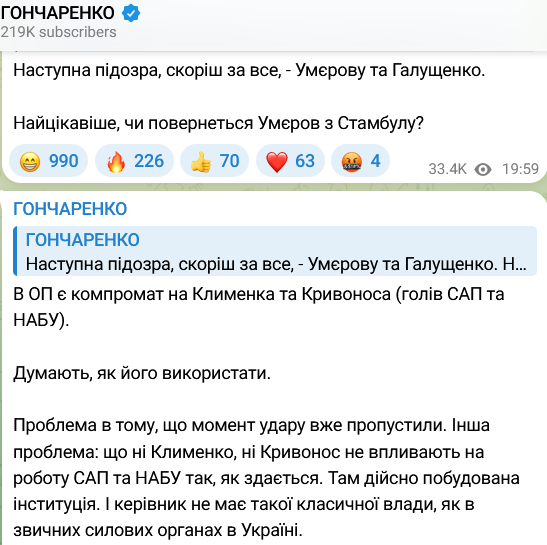 Наступні підозри, на думку Гончаренка, буде виписано секретареві РНБО Рустему Умерову та міністру юстиції Герману Галущенку.