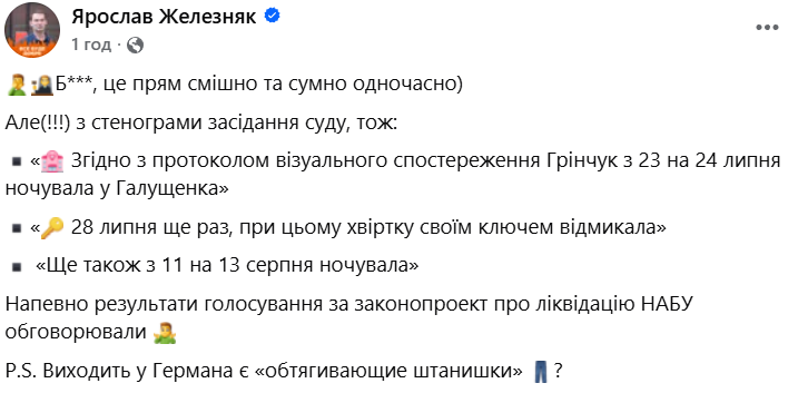 "Згідно з протоколом візуального спостереження Грінчук з 23 на 24 липня ночувала у Галущенка. 28 липня ще раз, при цьому хвіртку своїм ключем відмикала. Ще також з 11 на 13 серпня ночувала", - заявив прокурор.