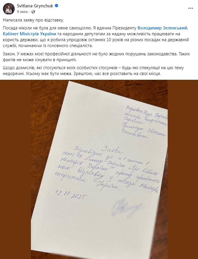 Голова Міністерства енергетики Світлана Грінчук після корупційного скандалу із тіньовими заробітками на "Енергоатомі" написала заяву про відставку.
