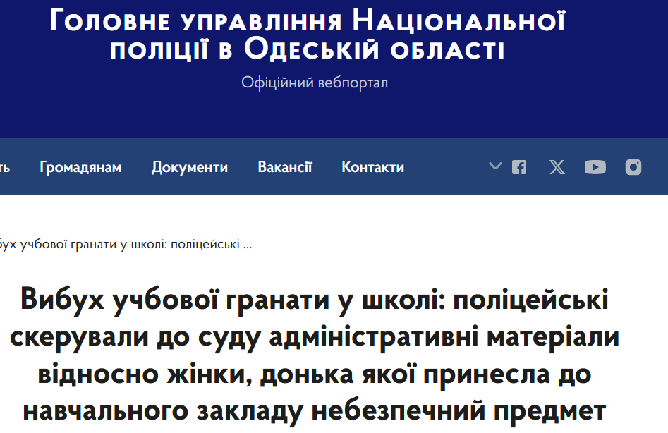 "Дівчинка принесла навчальну гранату, щоб похвалитися нею перед товаришами. Під час гри в коридорі один з хлопчиків випадково висмикнув запобіжне кільце гранати, що призвело до її вибуху.