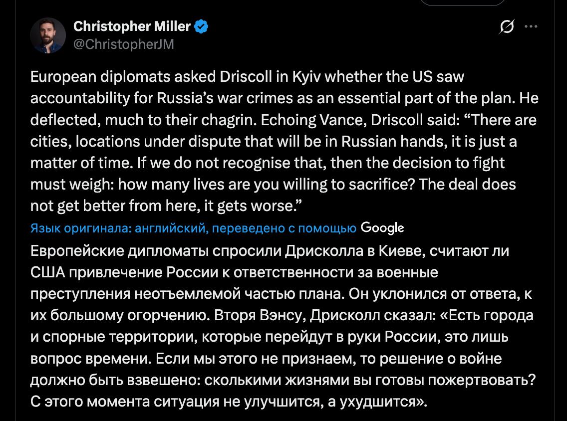"Є міста та спірні території, які перейдуть до рук Росії, це лише питання часу. Якщо ми цього не визнаємо, то рішення про війну має бути зважено: скільки життя ви готові пожертвувати? З цього моменту ситуація не поліпшиться, а погіршиться", – заявив Дрісколл.
