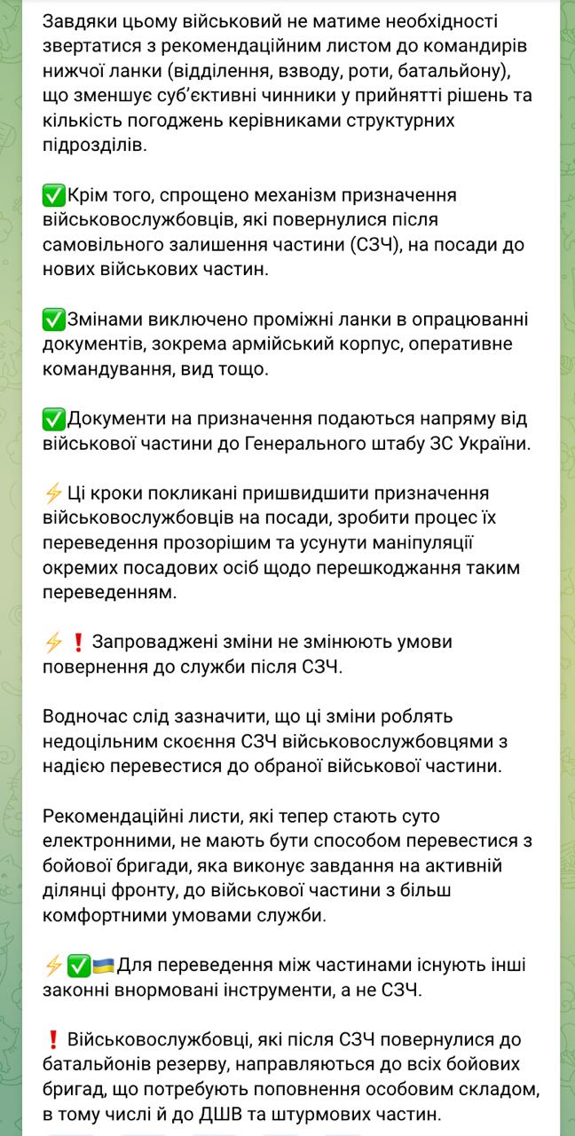 Зокрема, при призначенні військовослужбовців, які повернулися із СЗЧ, на посади у нові військові частини, виключено проміжні ланки у опрацюванні документів, зокрема армійський корпус, оперативне командування та інші. Документи на призначення подаються безпосередньо від військової частини до Генштабу.