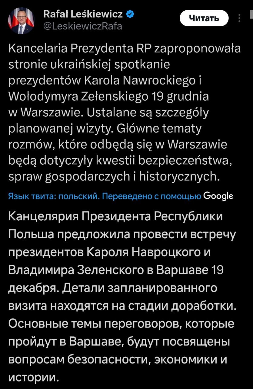 Про це повідомив представник польського президента Рафал Лескевич у соцмережі X.