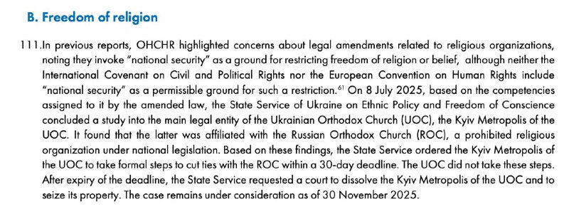 Також в ООН засудили закон, який відкриває шлях до заборони УПЦ. У документі наголошується, що церкву не можна переслідувати лише на підставі історичного зв'язку з РФ.