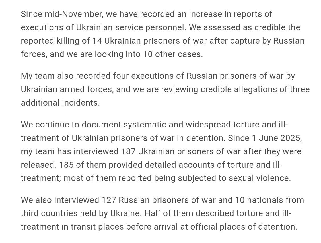 Крім того, ООН звинуватила і Україну, і Росію у вбивствах та тортурах військовополонених. Так, із середини листопада зафіксовано зростання повідомлень про страти українських військовослужбовців. За оцінкою ООН, заслуговують на довіру дані про вбивство 14 українських військовополонених після їх захоплення російськими військами, ще 10 випадків перебувають у стадії розслідування. Також задокументовано чотири випадки страти російських військовополонених українськими збройними силами. Крім того, вивчаються достовірні твердження ще про три подібні інциденти.