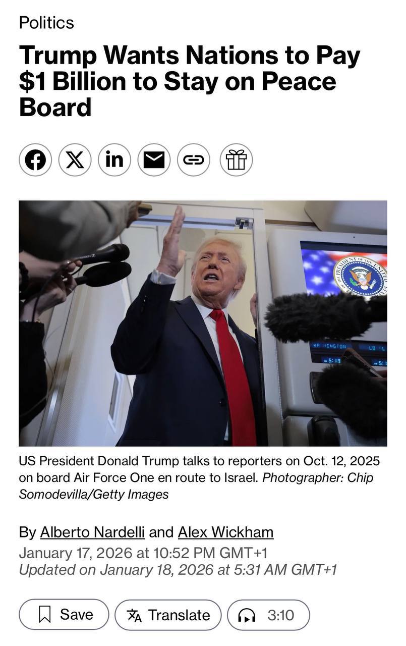 "Американський чиновник підтвердив агентству Bloomberg News, що, хоча вступ до організації буде безкоштовним, внесок у розмірі 1 мільярда доларів забезпечить постійне членство. Зібрані кошти будуть використані безпосередньо для виконання мандату Ради світу з відновлення Гази, заявив чиновник, який говорив на умовах анонімності. Рада забезпечить використання майже кожного зібраного долара для виконання свого манд".