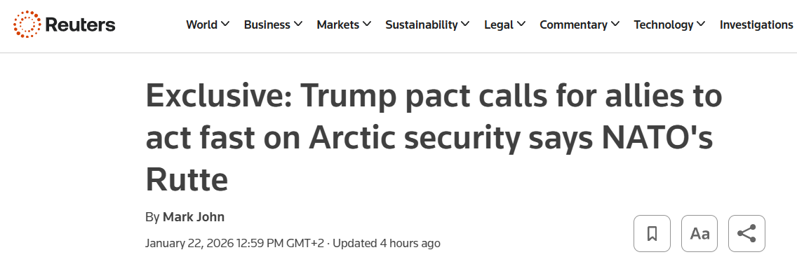 Нагадаємо, напередодні Трамп заявив, що з генеральним секретарем НАТО він уже сформував рамки майбутньої угоди щодо Гренландії, а тому він не вводитиме мита проти європейських країн.