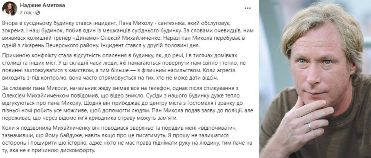 За їхніми словами, слюсар-сантехнік "Печерськжитло" 53-річний Микола П. звернувся до правоохоронних органів із заявою про побиття з боку Михайличенка, яка сталася 21 січня у підвалі будинку на вулиці Мазепи. Микола повідомив, що того дня розбирався з опаленням у бойлерній та побачив, як до нього спустився мешканець, якого він одразу дізнався: це був відомий футболіст та тренер Михайличенко. Візитер затіяв з ним словесну суперечку і вдарив по обличчю і ногою в область паху.