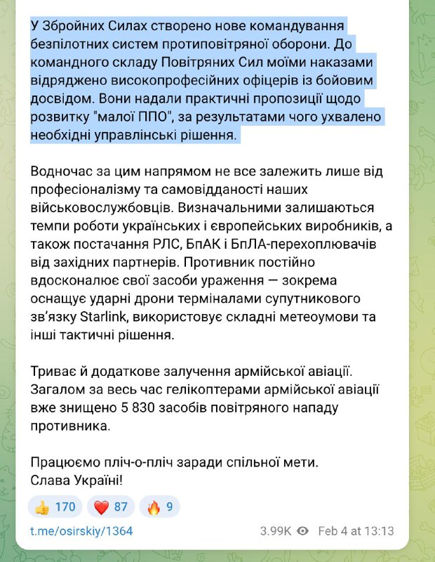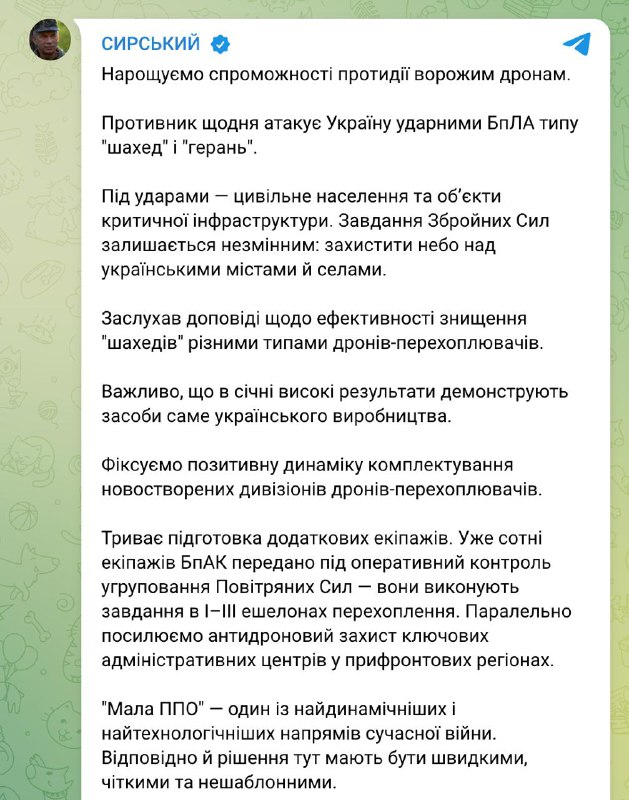 14.47 У ЗСУ створено нове командування безпілотних систем протиповітряної оборони, повідомив головком Сирського. Вже сформовано їхній командний склад. Як повідомляється, це високопрофесійні офіцери з бойовим досвідом, які представили практичні пропозиції щодо розвитку "малої ППО". Прийнято відповідні рішення.