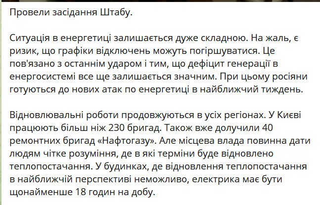 13.22 За добу після російського удару у Києві не змінилася кількість будинків без опалення. Зеленський повідомляє, що на сьогодні таких понад 1100. Учора таку саму цифру наводив Кличко.
