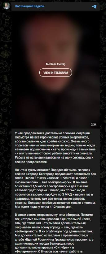 11:46 Губернатор Білгородської області Гладков заявляє про те, що в місті після вчорашніх обстрілів на сьогоднішній ранок близько 80 тисяч людей залишалися без тепла, три тисячі без газу, тисячу без світла.