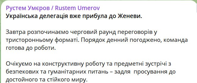 21.28 Українська делегація прибула до Женеви, де завтра стартує черговий раунд переговорів у тристоронньому форматі, повідомив голова делегації Рустем Умеров.