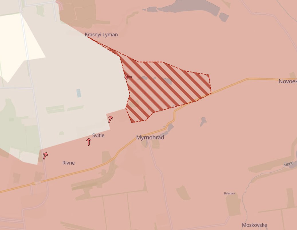 "Закріплення в цьому районі дозволяє противнику здійснювати накопичення для подальшого просування в глибину перешийка між Покровським і Родинським, що збільшує ризик залишків угруповання Сил оборони на околицях Мирнограда", - пише паблік.