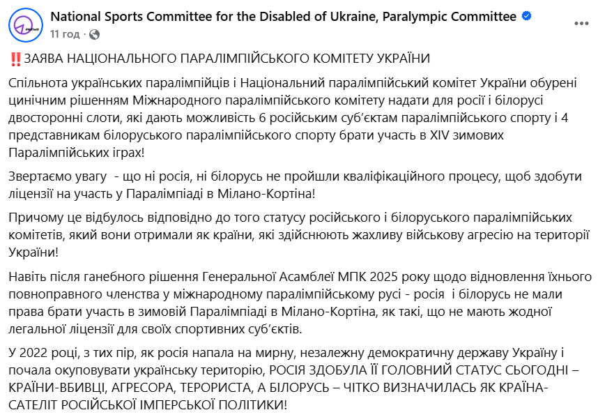 "Спільнота українських паралімпійців та Національний паралімпійський комітет України обурені цинічним рішенням Міжнародного паралімпійського комітету надати для Росії та Білорусі двосторонні слоти, які дають можливість 6 російським суб'єктам паралімпійського спорту та 4 представникам білоруського паралімпійського спорту брати участь у XIV зимах.
