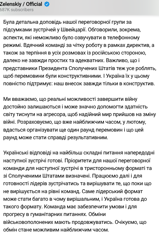 "Українські відповіді на найбільш складні питання напередодні наступної зустрічі готові. Працюємо далі і для готовності лідерів зустрічатися і вирішувати, що поки не вирішується на рівні команд. Саме лідерський формат може стати багато в чому вирішальним, і Україна готова до такого формату. Команда повинна забезпечити умови для прогресу в гуманітарних питаннях. написав президент.