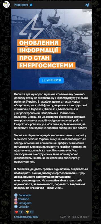 11:31 "Укренерго" заявляє, що через нічні удари знеструмлено частину споживачів в Одеській, Київській, Миколаївській, Дніпропетровській, Запорізькій та Полтавській областях.
