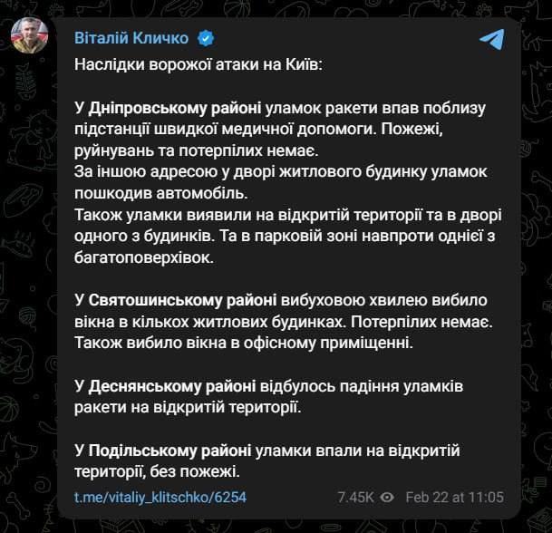 Виходячи з його повідомлення, на Київ падали уламки збитих ракет.