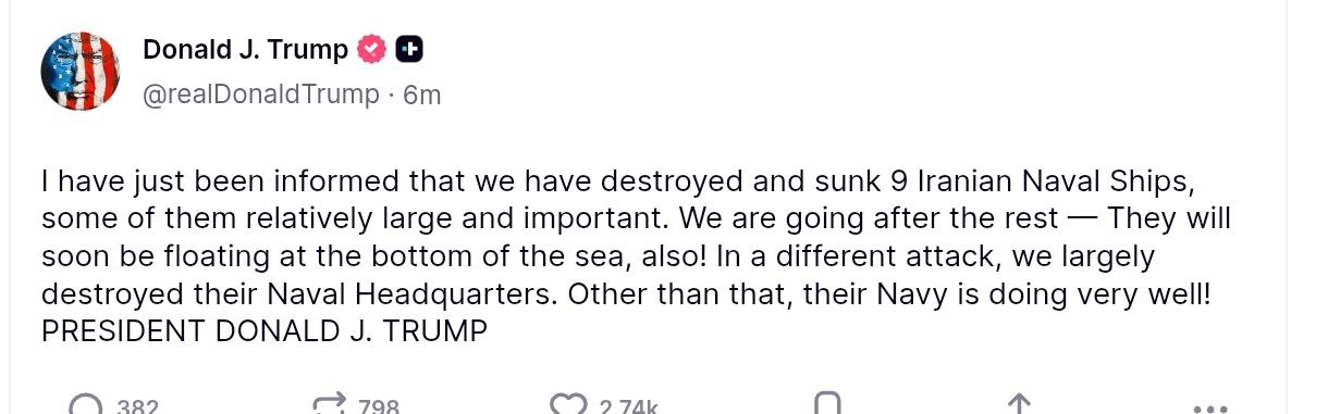 "Мене щойно поінформували, що ми знищили та потопили 9 іранських військово-морських кораблів, деякі з них були відносно великими та важливими", - написав він у своїй соцмережі.