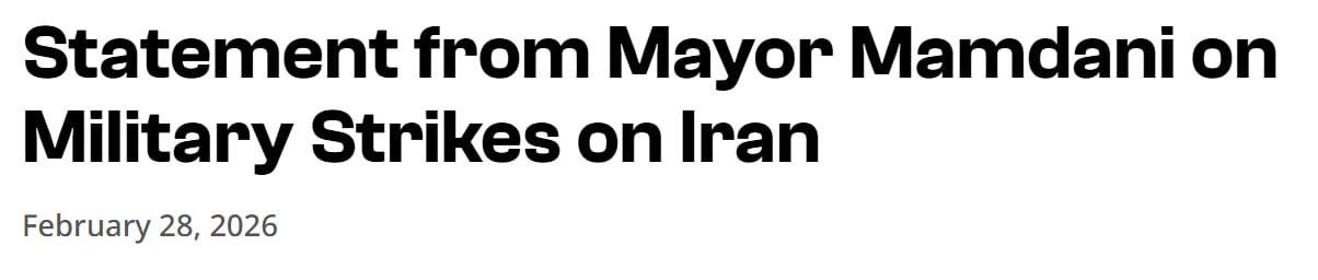 "Військові удари по Ірану, завдані Сполученими Штатами та Ізраїлем, знаменують собою катастрофічну ескалацію незаконної агресивної війни. Бомбардування міст. Вбивства мирних жителів. Відкриття нового театру воєнних дій. Американці цього не хочуть. Вони не хочуть нової війни в гонитві за зміною режиму. Вони хочуть позбутися кризи доступності житла. Вони хочуть миру", - заявив Мамдані.