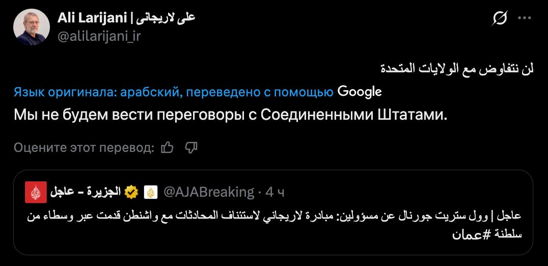Він перепостиг повідомлення американської газети The Wall Street Journal про те, що Ларіджані передав США пропозицію про переговори через Оман.