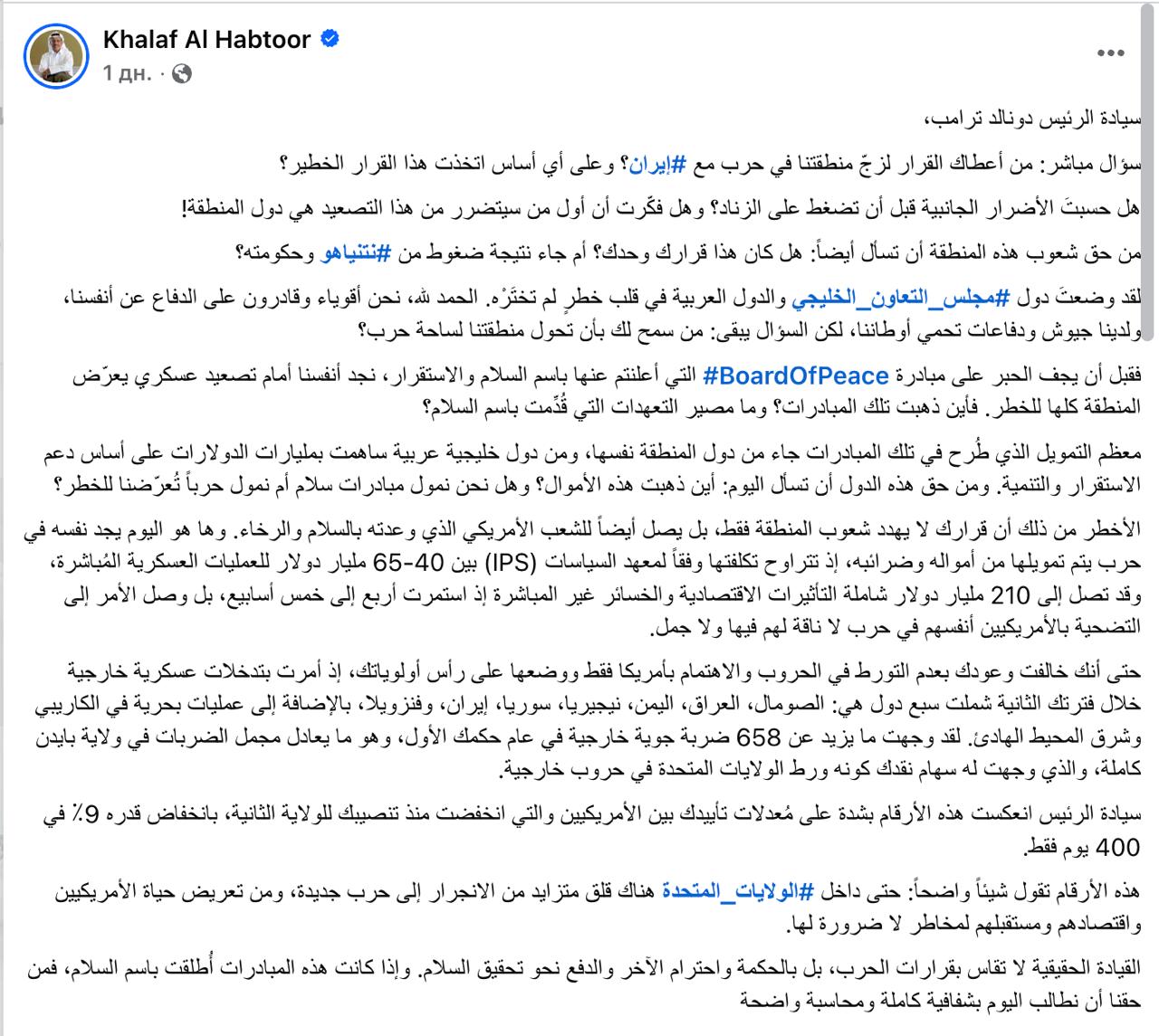 "Хто дав вам право втягувати наш регіон у війну з Іраном? І на якій підставі було ухвалено це небезпечне рішення? Чи підрахували ви побічні наслідки, перш ніж натиснути на спусковий гачок? І чи подумали ви, що першими постраждають від цієї ескалації саме країни регіону?" – пише 77-річний Аль Хабтур.